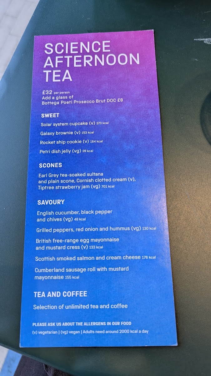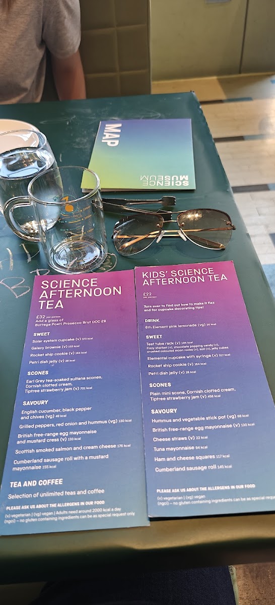 From a reviewer’s perspective, the menu at Gallery Cafe (Level 2) offers a charming mix of drinks, sweet treats, and savoury bites that feel perfectly suited to a light museum break. The drinks selection ranges from Bottega Poeti Prosecco Brut Doc, Satellite Sauvignon Blanc Marlborough, Santa Rita Gran Hacienda Pinot Noir, and Champagne De Castellane Brut Nv to cocktails like Mimosa and Pink Spritz, alongside soft options such as Apple Juice, Orange Juice, Pink Lemonade, and Elderflower Fizz. For those with a sweet tooth, the themed desserts-Solar System Cupcake, Galaxy Brownie, Rocket Ship Cookie, and Petri Dish Jelly-add a playful touch. The savoury selection is simple but satisfying, including English Cucumber, Black Pepper And Chives, Grilled Peppers, Red Onion And Hummus, British Free-Range Egg Mayonnaise And Mustard Cress, Scottish Smoked Salmon And Cream Cheese, and the hearty Cumberland Sausage Roll With Mustard Mayonnaise. Overall, the menu is concise yet thoughtfully curated, offering a pleasant balance of light snacks, themed sweets, and refreshing drinks that complement the café’s museum setting.